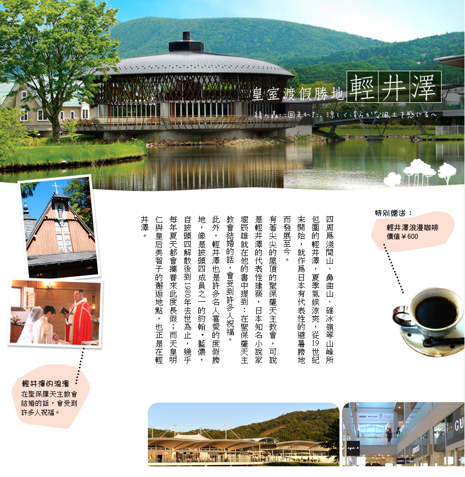 1886年,經由加拿大傳教士的介紹,輕井澤成為了日本著名的避暑勝地,並形成了獨特的文化。從東京出發乘坐北陸新幹線只需1小時即可到達,十分方便,目前已成為廣受好評的度假勝地。在這裡,您可以參觀輕井澤高原協會、舊三笠賓館等歷史底蘊深厚的人文景觀,欣賞雲場池等風景迷人的自然景觀,也可以享受高爾夫、騎馬、滑雪等運動項目,或在名牌折扣購物中心盡情購物。輕井澤一年四季都吸引著數量眾多的遊客前來度假。請您在位於輕井澤站旁的古色古香的觀光協會裡,挑選自己喜歡的觀光景點。選定目標,馬上出發吧!
